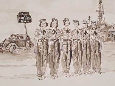 The scene features women working as carhops, a hallmark of mid-century drive-in culture, who served customers directly at their cars and became recognizable figures of the era. Their uniforms, gestures, and interactions—alongside period vehicles and architecture—illustrate the optimism, social connection, and everyday rituals that defined this chapter of American history.
