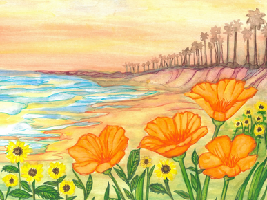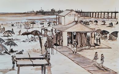 Created as a commissioned piece for Dwight’s Beach Concession, this artwork captures the playful spirit and early days of Huntington Beach when sun umbrellas dotted the sand, and beachgoers gathered for simple seaside fun. Founded in 1932, Dwight’s was the very first concession on the beach—serving generations of locals and visitors as a hub of coastal life just steps from the shore. Painted in warm sepia watercolor and gouache, Dwight’s Circa 1932 blends nostalgia with whimsy, celebrating a time when beach days were unhurried, community mattered, and the shoreline buzzed with laughter, towels, and timeless summer rituals. This piece honors not just a place, but a living piece of Huntington Beach history.